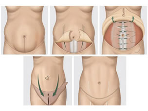 Una abdominoplastia completa dura entre dos a cuatro horas dependiendo de la extensión del trabajo que implica y si no se combina con algún grado de liposucción. Después de que la incisión se hace, se levanta la piel del abdomen por encima del ombligo. El ombligo se corta libre de esta piel y se deja en su fijación natural. Este es posteriormente exteriorizado a través de una nueva incisión. Los músculos abdominales se tensan con suturas gruesas, propias para ayudar a reducir su cintura. El exceso de piel y grasa se elimina y se cierra la incisión. Los resultados finales pueden estar ocultos al comienzo por la hinchazón y su imposibilidad de pararse completamente erguido hasta que las heridas internas sanen. En las mujeres que hayan tenido una cesárea, las cicatrices existentes pueden incorporarse casi siempre a la nueva cicatriz. El resultado será un abdomen más plano, con mejor tono muscular. Un candidato para abdominoplastia, debe comprometerse a permanecer dentro de un promedio de peso ideal para maximizar los resultados.